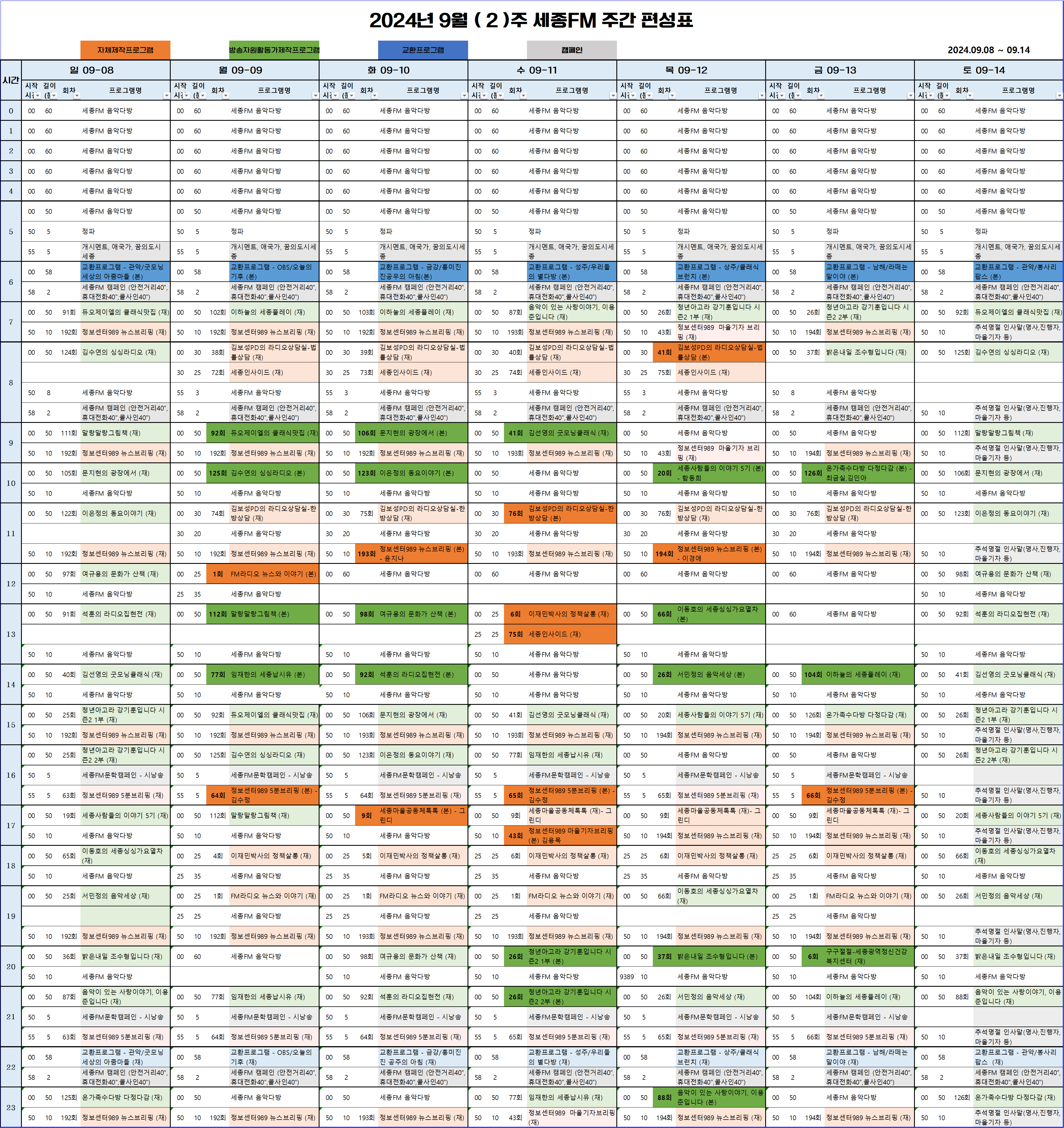 (세종FM 주간 편성표는 방송사의 사정에 따라 변경될 수 있습니다.)